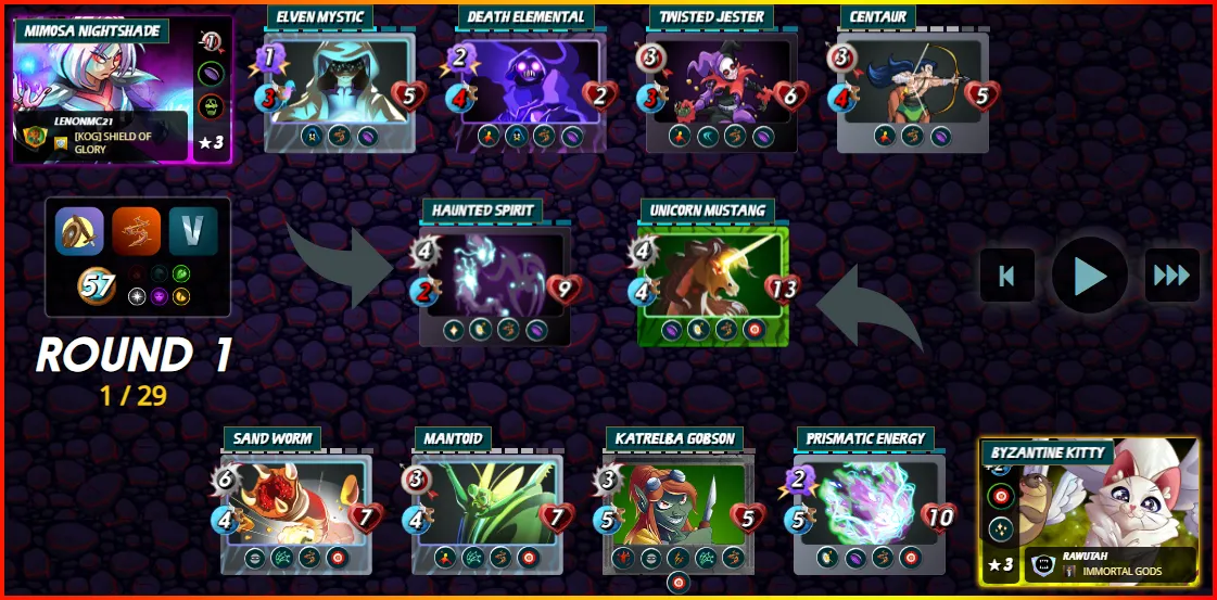 En esta batalla creí que estaba mejor preparado que la anterior, las reglas de batalla me decían que los ataques físicos serian peligrosos, así que armé mi “Estructura” de juego con la intención de debilitar el rango y la posibilidad de utilizar “Heal, Tank Heal o Triage”, además, al solo poder jugar 5 cartas me dije, que podría salir mal, pues resulto que no todo es lo que parece y mi oponente hizo una jugada magistral al combinar el invocador “Byzantine Kitty” con un ataque poderosos físico con “Sneak”, algo que, por supuesto no me esperaba, en este caso la combinación de este invocador con “Katrelba Gobson y Sand Worm”, fue explosiva, ya que destrozaron mi línea trasera en la cual no coloque defensas, sin mencionar que, su “Katrelba” era de nivel 8, el máximo para la liga de “Oro”.