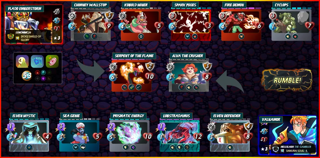 La primera batalla fue contra “Hatoto” del gremio “Legendary Dragons”, un gran jugador, el cual me sorprendió o leyó mi mente más bien jaja, ya que, para esta batalla las “Reglas” dictaban que las formaciones deberían de ser un poco más físicas, sin embargo, las cartas que jugué fueron con la intención de tomar por sorpresa a mi oponente, así que decidí ir con la mayoría de mis cartas con ataques mágicos y de rango, sin embargo, mi oponente me demostró que, el equipo de fuego puede ser muy bueno en muchas ocasiones sin la necesidad de un ataque 100% físico, por lo que, al jugar con “Almo Cambio y Chimney Wallstop”, me desequilibro por completo mi juego, en especial porque su “Gladius” era de nivel 8.