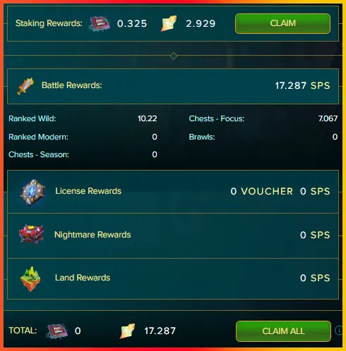 En mi opinión y experiencia en los días que llevo jugando en este nuevo sistema clasificado, puedo decir que hay una mejora significativa en las recompensas que se obtienen en el token SPS por ganar batallas, por supuesto, hablo desde el juego clasificado en el “Formato Salvaje”, no estoy seguro de cómo se comportan las recompensas en el “Moderno”, pero, no debe ser malo tampoco, ya que me hubiera enterado por las diferentes comunidades existentes.