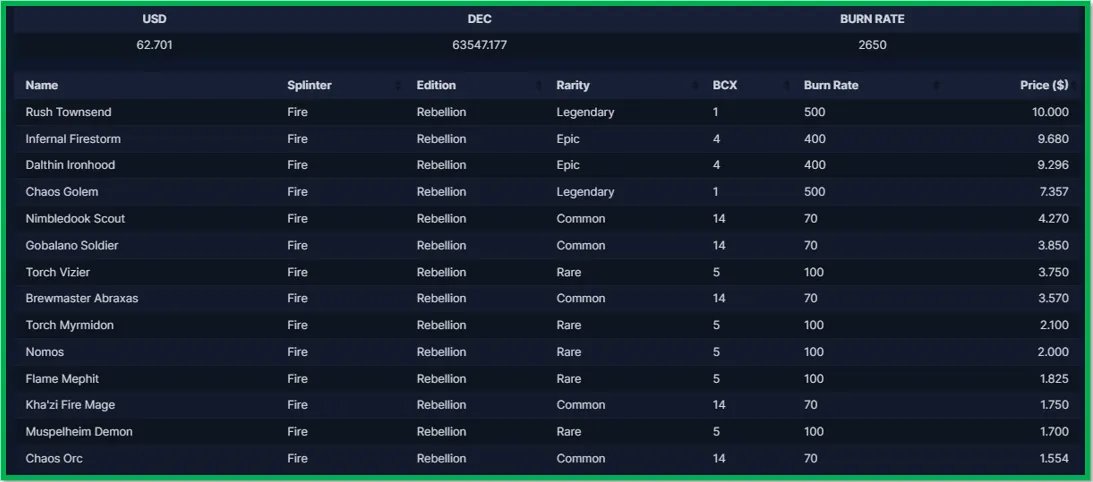 In the last image you can see that, after clicking on "Calculate", the platform gives me a detailed table, indicating the amount in USD of the deck I chose, in this case, the complete SET of fire for the edition of "Rebellion" has a cost of 62. 70$, amount that is equivalent to 63637.47 DEC, which is the token used to acquire all kinds of assets in the game, last but not least, we get the burning value of each of the cards that make up the fire deck I chose, which is equal to the "Collection Power".