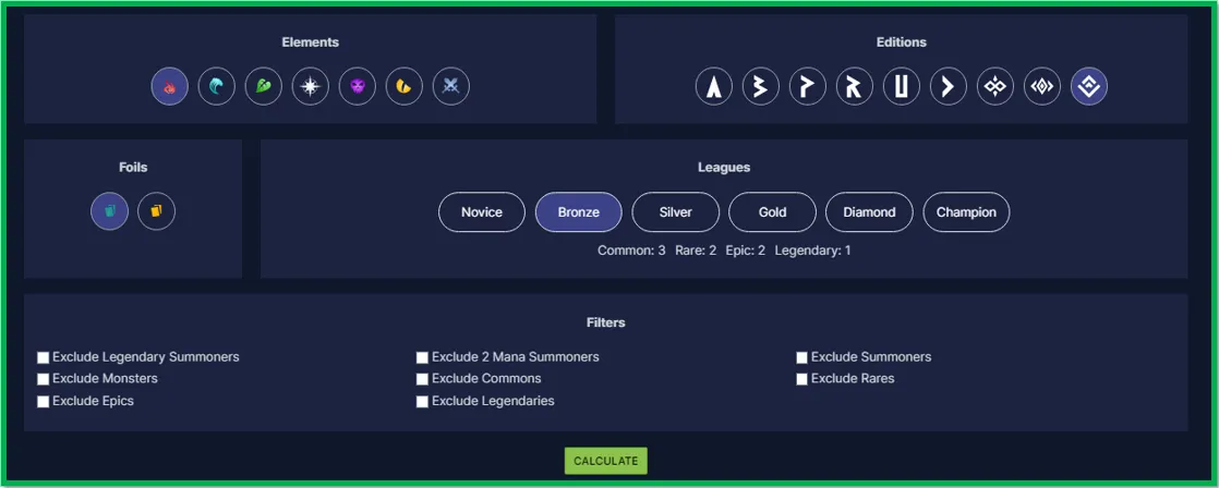 Step 1: In the image above you can see the options I selected as an example, so, what you should do is select the element you want to observe first, then the edition, select the type of sheet, in this case if you are starting, it is best to start with the "Regular", not the gold, since for obvious reasons it is more expensive and finally the league in which you are thinking of competing. Although, additionally you have a series of options available in some boxes to check and exclude what you want from that list, this will reduce the cost, but, for this example, I did not exclude anything, I selected the "Fire" element, the "Rebellion" edition, the regular foil and the "Bronze" league, and then click on "Calculate".