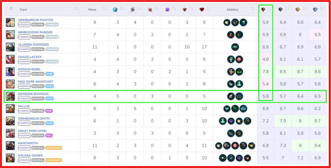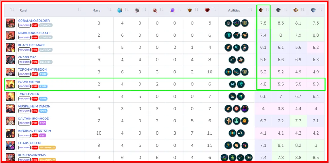 In the image above you can see that I have selected the fire deck cards for the "Rebellion" edition, so, according to the platform data, the card called "Flame Mephit", for the "Bronze" league, is not very useful, since it has a score below 5. 5 points, which tells us that it is not very effective on the battlefield, since it has a score of 4.8 points. This means that we could replace this card with another one, in this case taking into account the "Splinter Neutral", which can play with any element.