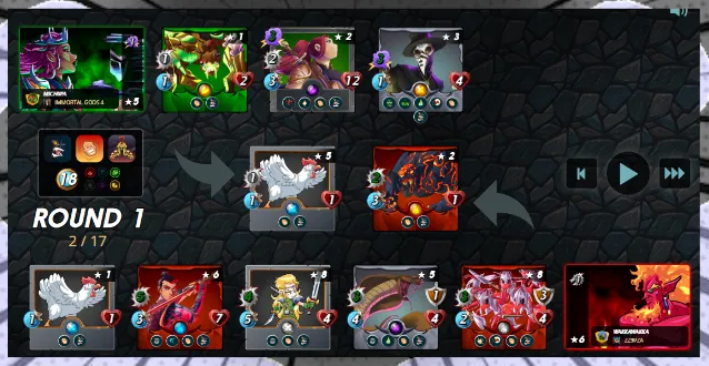 - Com tão pouca mana disponível e a possibilidade da utilização da Quora nessa partida, meu oponente cometeu o primeiro erro: Colocou um monstro frágil na primeira posição. Isso é um prato cheio para que a Quora adquirisse seu primeiro buff e ficasse mais forte logo no começo.