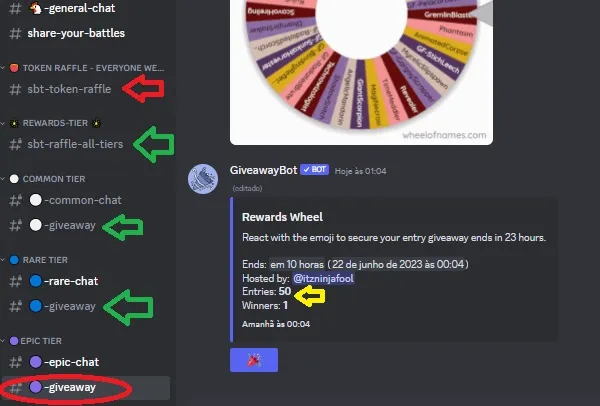 Neste print do discord é mostrado como funciona o sorteio basta clicar no bot e entao um usuario é escolhido aleatoriamente e entao uma outra roleta é sorteada para mostra qual carta vc ganhou, e lembrando que isso acontece todos os dias para cada Stake que pertencer terá uma nova carta sera destribuida | In this discord print it is shown how the draw works, just click on the bot and then a user is randomly chosen and then another roulette wheel is drawn to show which card you won, and remembering that this happens every day for each Stake that belongs will have a new letter will be distributed | En este discord print se muestra como funciona el sorteo, solo haz clic en el bot y luego se elige al azar un usuario y luego se sortea otra rueda de ruleta para mostrar que carta ganaste, y recordando que esto pasa todos los días por cada Stake que pertenezca tendrá una nueva carta será distribuida |