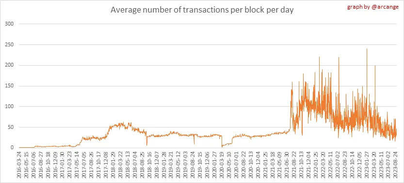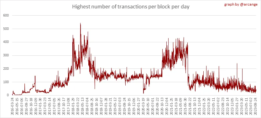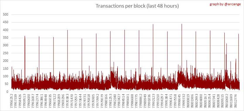 These graphs show the number of transactions per day, and the highest number of transactions per block, the average number of transactions per block, and the number of transactions per block for the last 48 hours. This gives you an idea of the whole activity on the blockchain.