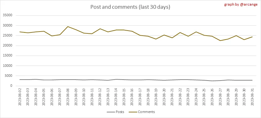 These graphs show the evolution of posts and comments for the whole blockchain lifetime and the last 30 days.