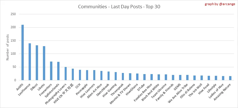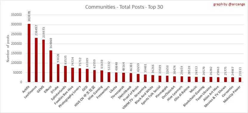 These graphs show the most active communities by number of posts (blockchain lifetime and last day).