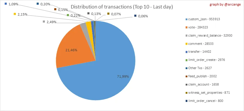 This graph shows the distribution of the top 10 types of transactions by number of operations performed on the blockchain.