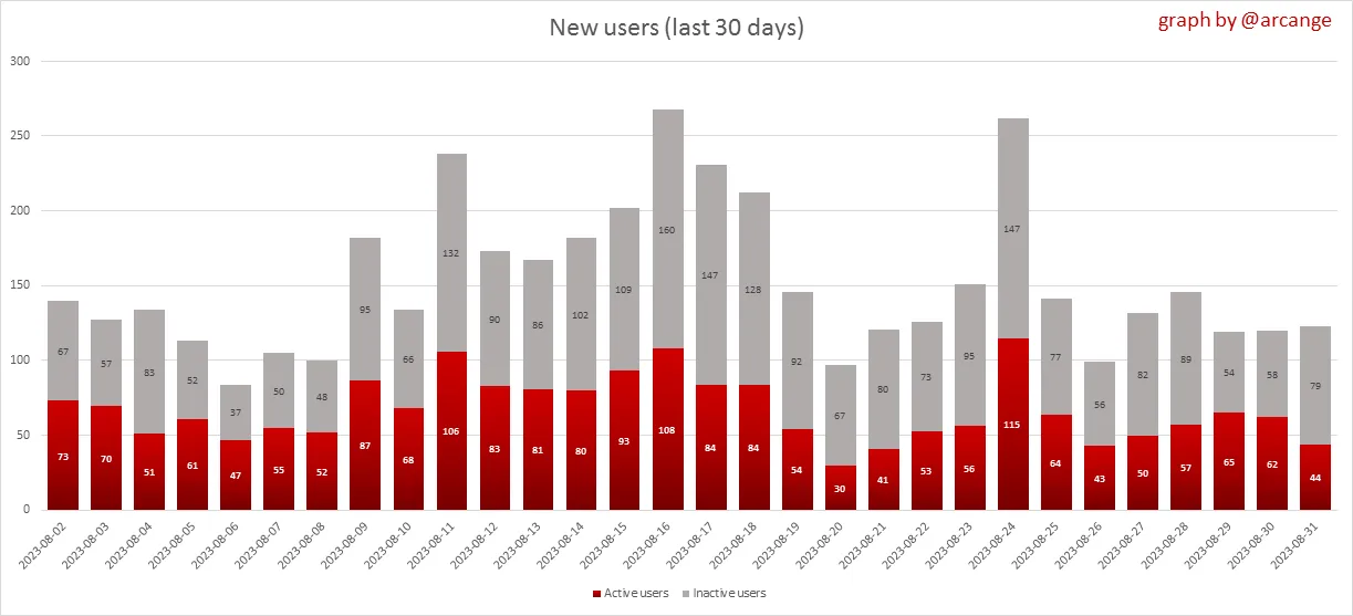 The grey part of each column indicates how many accounts are inactive (those who have not posted, commented or voted the last 30 days).