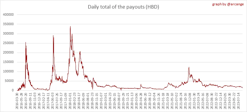 These graphs show the total of the distributed payout (posts and comments) for each day.