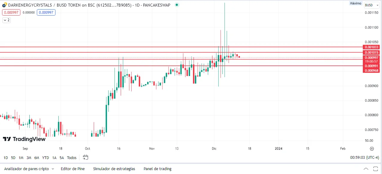 Como pueden observar, no hay mucho que analizar, además de que, siendo un token estable, no podemos esperar una corrida de toros muy por encima del umbral de los $0.0010, y si observan con más detalle, el precio está totalmente encajonado en el rango de los $0.00096 y los $0.001033, lo que es realmente saludable para el DEC y el ecosistema en general.