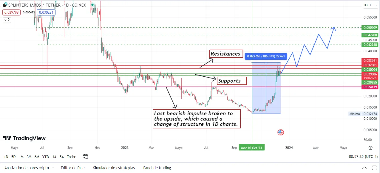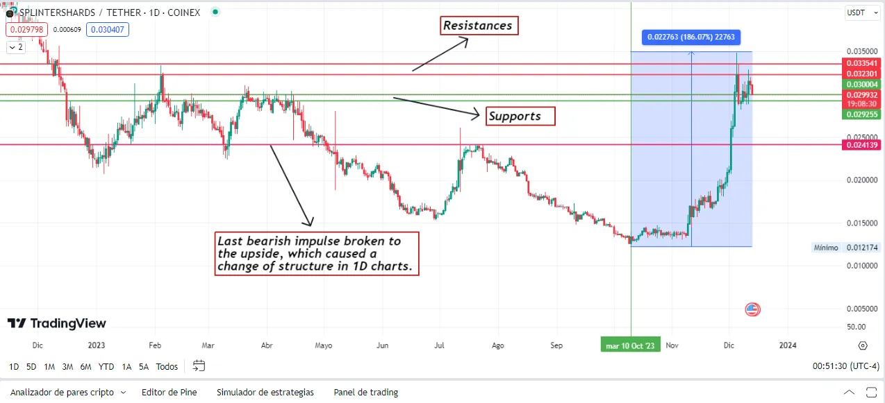 In this chart, we can see that, since October 10, the SPS price started its recent bullish momentum, and since then, it has had an abysmal rise that has reached 186.07%, a total madness, on the other hand, we see that the last bearish momentum that broke the previous lows, has been broken upwards, which tells us that, it changed the market structure, so, it went from being bearish, to be bullish, this happened in 1 day charts, a quite high time frame, which indicates a large buying force.
