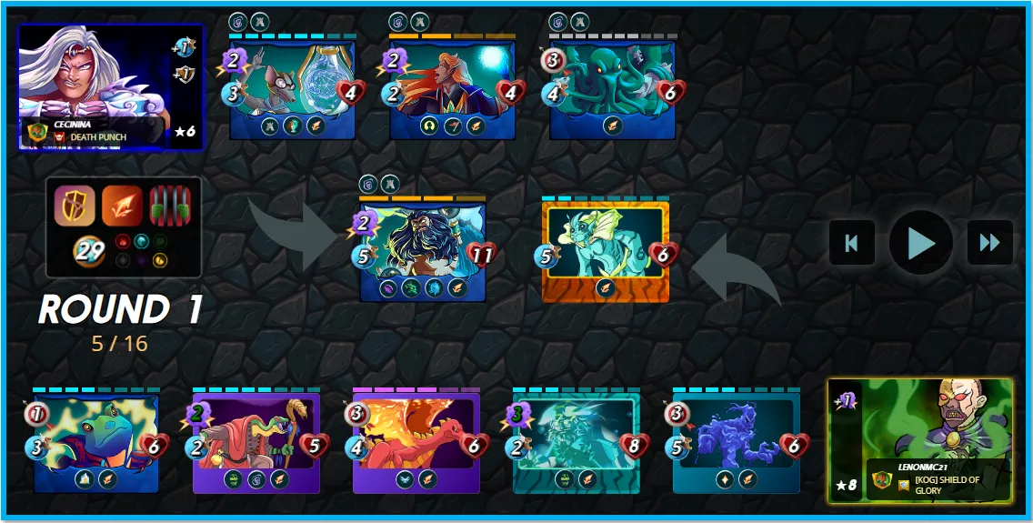 Ahora que sabemos exactamente los efectos que tendrán las reglas en el campo de batalla, lo siguiente es tener en cuenta la cantidad de mana disponible para jugar las mismas, además del “Splinter” que jugaremos, por supuesto, así que, si tenemos solo 29 puntos de mana y podemos utilizar solo 3 splinters que son (Fuego, Agua y Dragón), debemos proceder a discernir que tipos de cartas necesitamos para la batalla:
