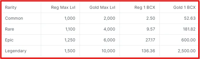 Step 1: Before starting and heading to Peakmonsters, it is important that you observe the following tables that I will show you below, the objective is that you can know how much production points each card will have per (HOUR) and how the previous editions (the older ones), have a significant impact on the production of resources in that plot, so, before doing anything, you should see this: