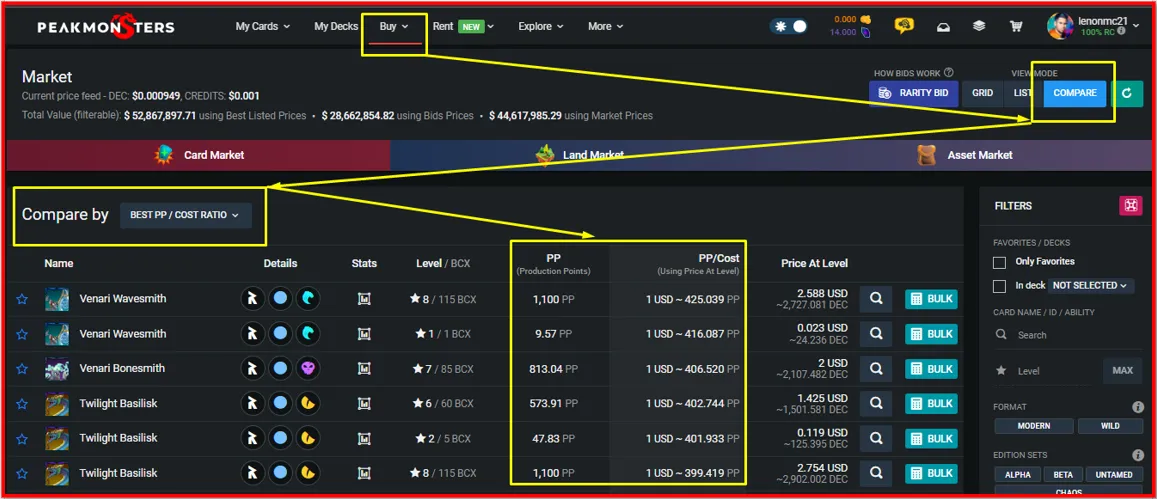 Step 2: Next, after verifying all the past information you shared, we will go to [Peakmonsters](https://peakmonsters. com/market), select "Market", click on COMPARE at the top right, and finally filter by the option that says BEST PP/COST RATIO, which will show us the best cards in relation to cost and production points, without forgetting that the highest PP will depend on the level of the card, in short the BCX it has, its rarity which is very important, if it is regular or gold foil and which edition it belongs to.