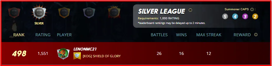 As you can see in the previous image, I played a total of 26 battles in "Silver 2", of those 26 I managed to win 16 and I had a good streak of 12 wins in a row, this resulted in only losing 10 battles, which is very good; and although I could not base my performance in this league in this way, playing only one day, I felt very comfortable, also, one of the strategies that I applied, was to only play with a "Summoner" in all the games, something that later I will tell you in detail with "Game Structures and/or Strategies" for this format.