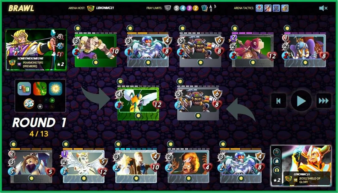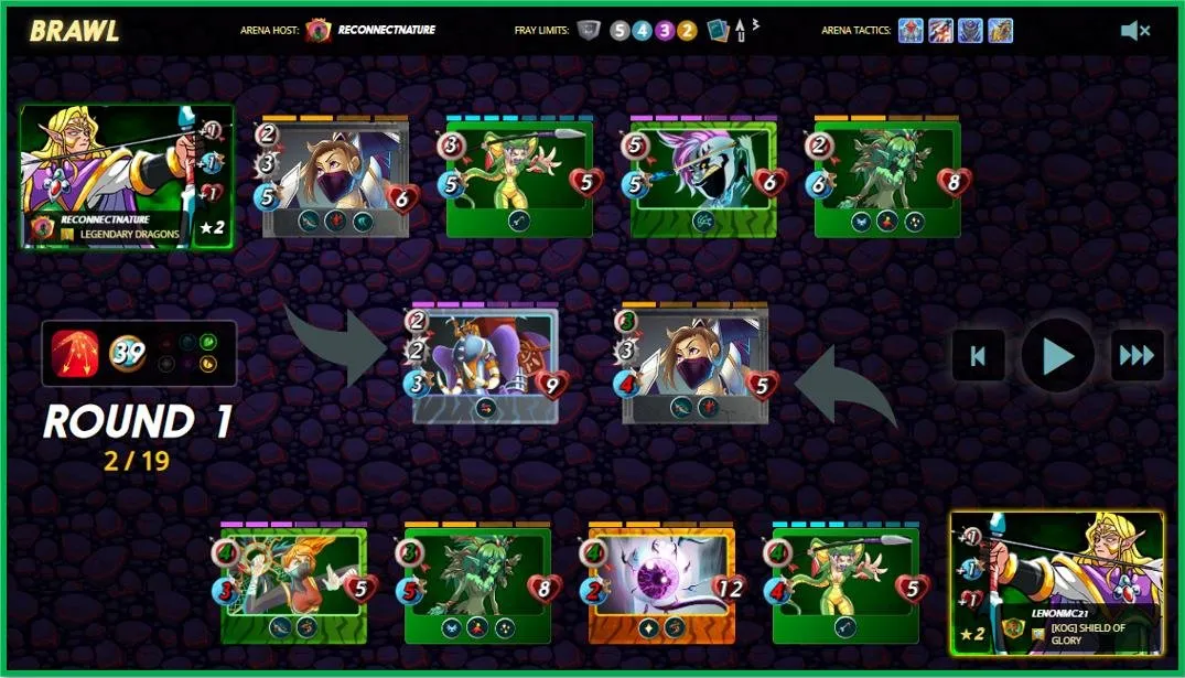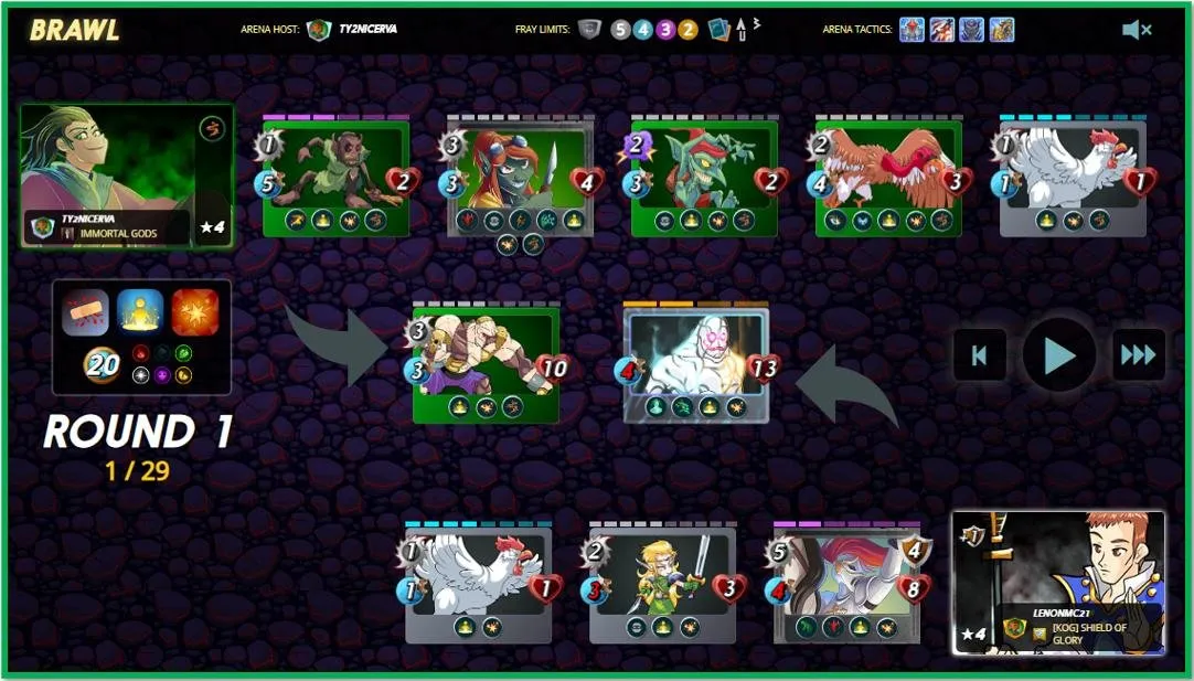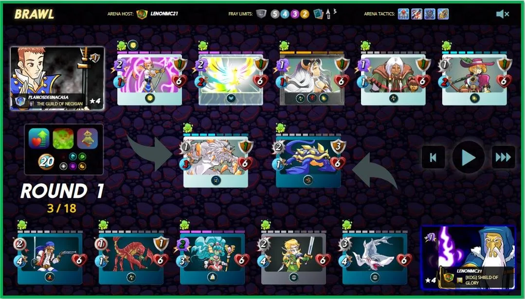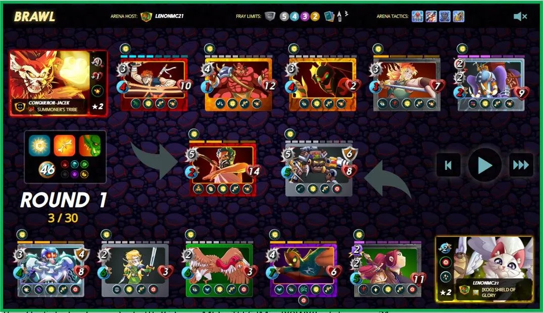 Este gremio ha sido durante mucho tiempo uno de los mejores de todo el juego y uno de nuestros acérrimos rivales, en esta oportunidad jugué contra una cuenta llamada @conqueror-jacek, fue una batalla con condiciones muy parecidas a las que ya había jugado anteriormente; y donde de casualidad obtuve mi victoria, aunque, para esta batalla quise jugar un poco distinto y despistar a mi oponente, ya que seleccioné al invocador llamado “Bizantine Kitty” para jugar, mi intención era cuidar de mis tanques principales, para que, mis cartas con las habilidades “Opportunity y Sneak”, hicieran su trabajo, lo que realizaron muy bien, pero, mi verdadera estrategia era aprovechar el daño del resto de mi ofensiva y que “Quora” terminara por rematar a cada carta, lo que funciono perfectamente para darle un total de ataque durante la partida de +16 puntos y una velocidad de +11 puntos, lo que me dio la victoria.