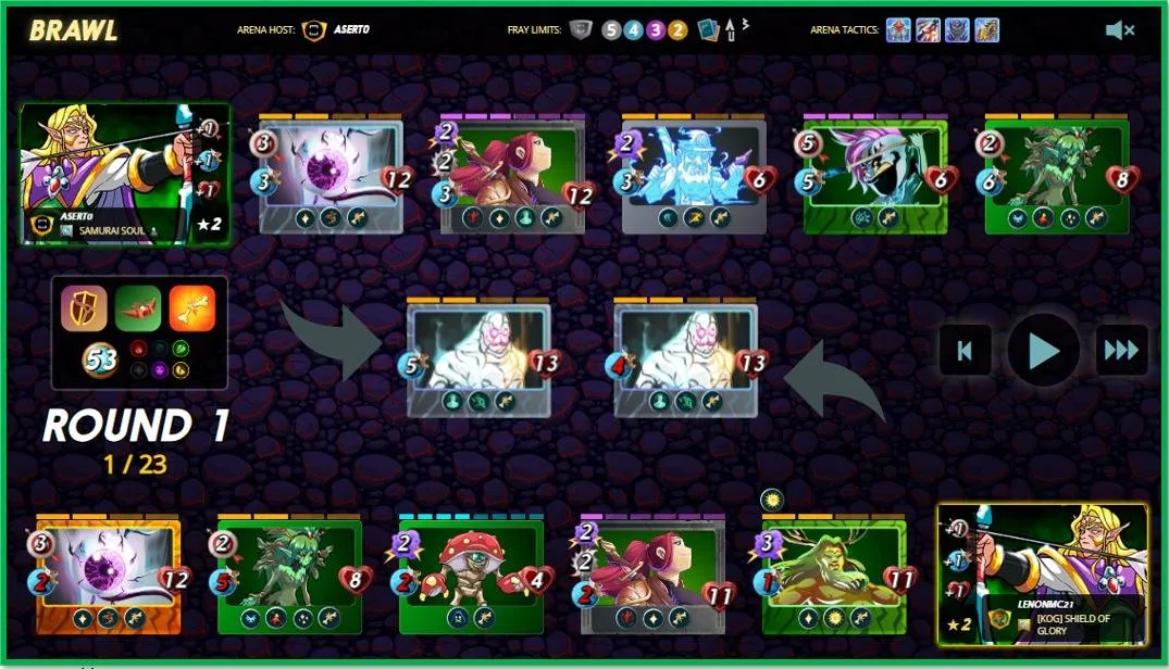 This battle was against a user named @aserto, it seems to me that it is the first time I face him, it was a very even battle, especially because I had already taken more confidence with my last victory, plus I already felt calmer, however, I suffered the defeat, because despite having played my cards well, I made a mistake, which cost me the battle, this mistake was to place 2 cards of magic attack, which did not support at all with the "Summoner" that I had selected for my battle, besides, I did not play any "Support" card that would help me to have the advantage, which my opponent did, playing with "Mushroom Seer and Kron the Undying", I decreased my chances, instead my opponent with "Spirit Miner and Mitica Headhunter", adapted and supported his team perfectly.