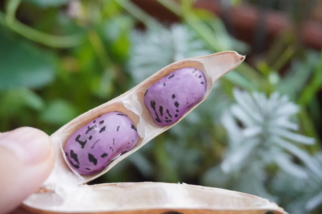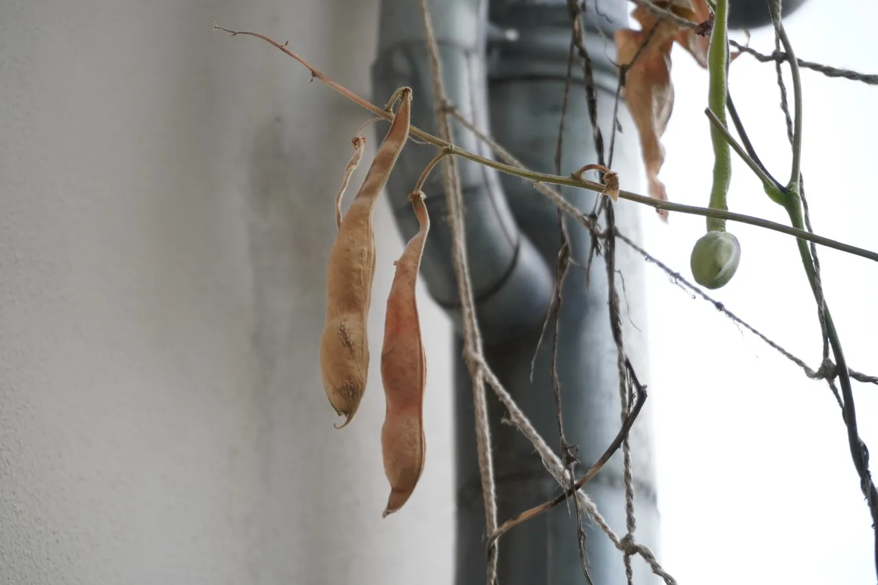 This morning, when I stepped out onto the balcony, I noticed that the pods of my scarlet runner beans had dried out. Upon opening them, I found beautifully formed seeds inside. Today, I harvested four seeds for next year. It's like having good plant friend.