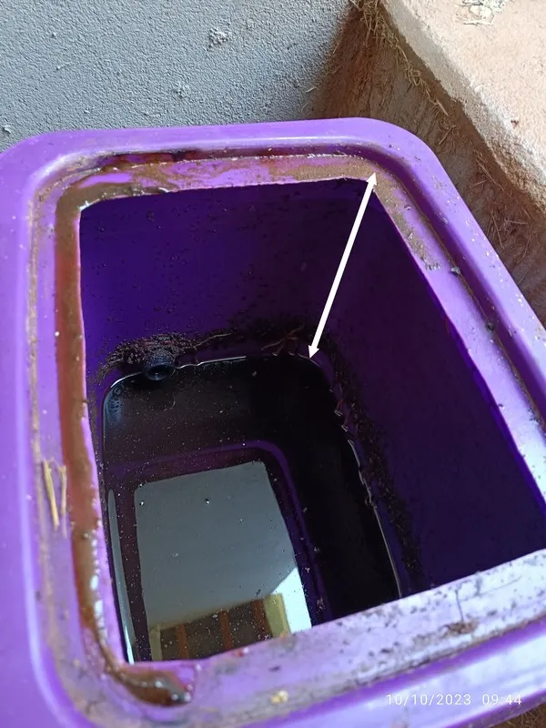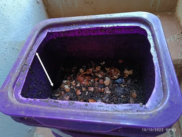 A segunda foto nos mostra o volume de chorume produzido. Veja pela flecha branca que adicionei que a quantidade é baixa. Esse líquido será retirado e reservado em um recipiente adequado para ser diluído em água, sendo usado como adubo líquido.