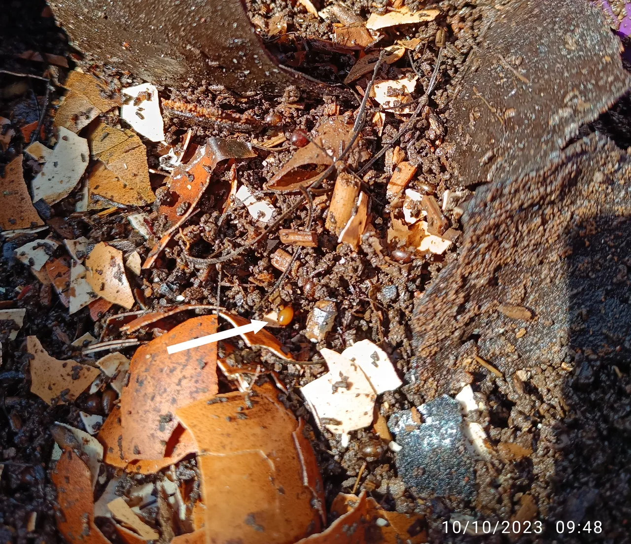 In the fourth photo we can see up close using the "macro" mode a cocoon, which is equivalent to a worm "egg". This cocoon has a good number of worms that will feed on the material left by their mother until they hatch.