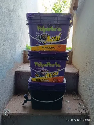 Eu tenho um conjunto de potes de plástico, que são resíduos da indústria de alimentos, eles tem capacidade de 5 litros cada. Estão empilhados em três compartimentos, sendo que os dois superiores tem furos na base permitindo a movimentação das minhocas entre todos eles.