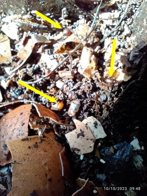 From another angle, and now with more arrows added, we can see that there are several cocoons on the surface of the material.ial, which means we have a healthy environment for our hard-working earthworms to reproduce!