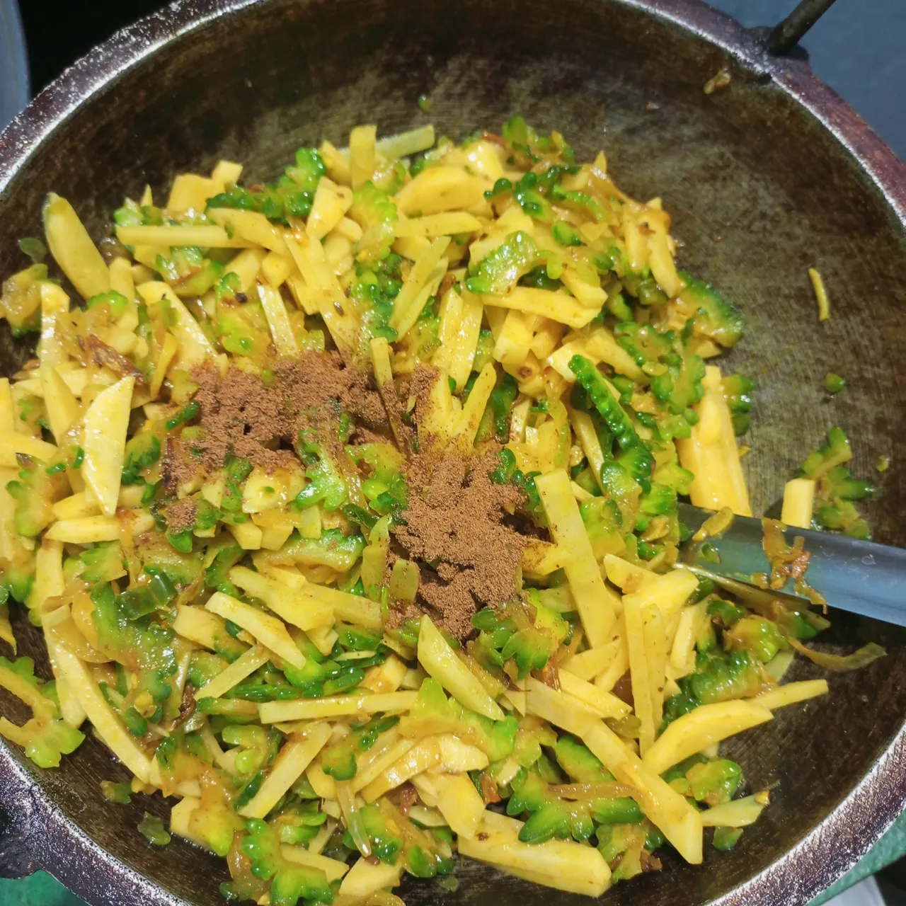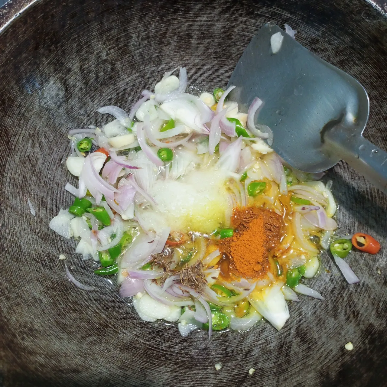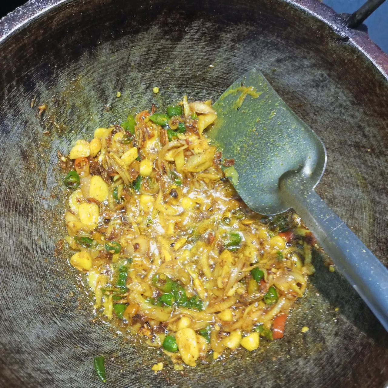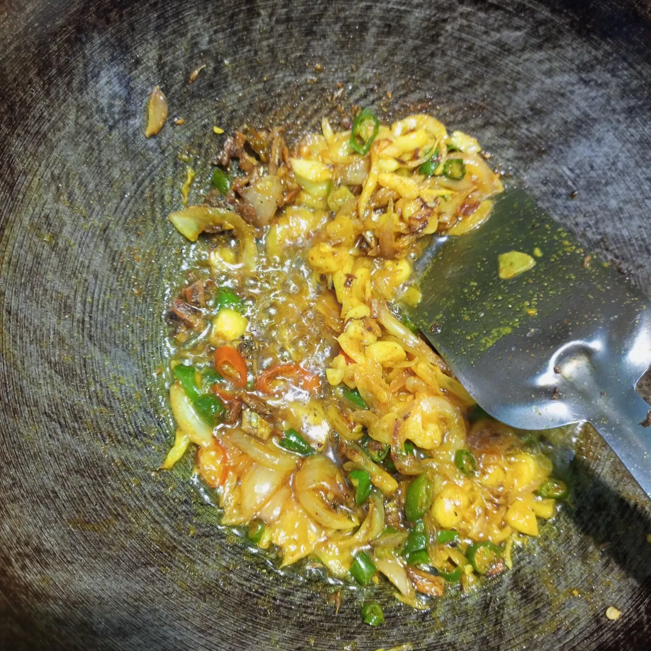 See all the materials will be red in yellow. Then we will add dry fish powder. Then the coconut color will come after that.