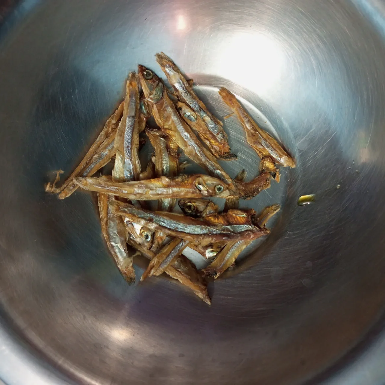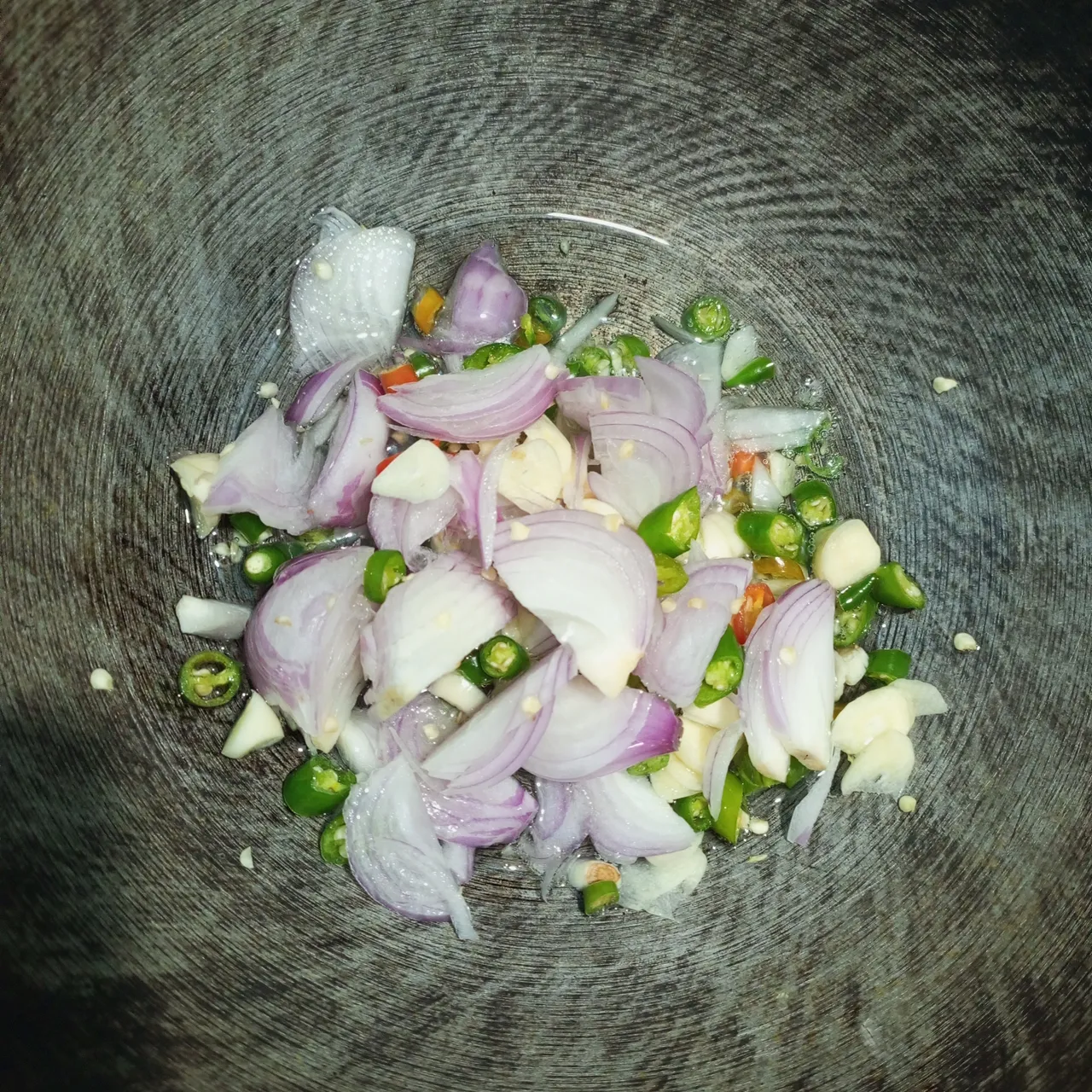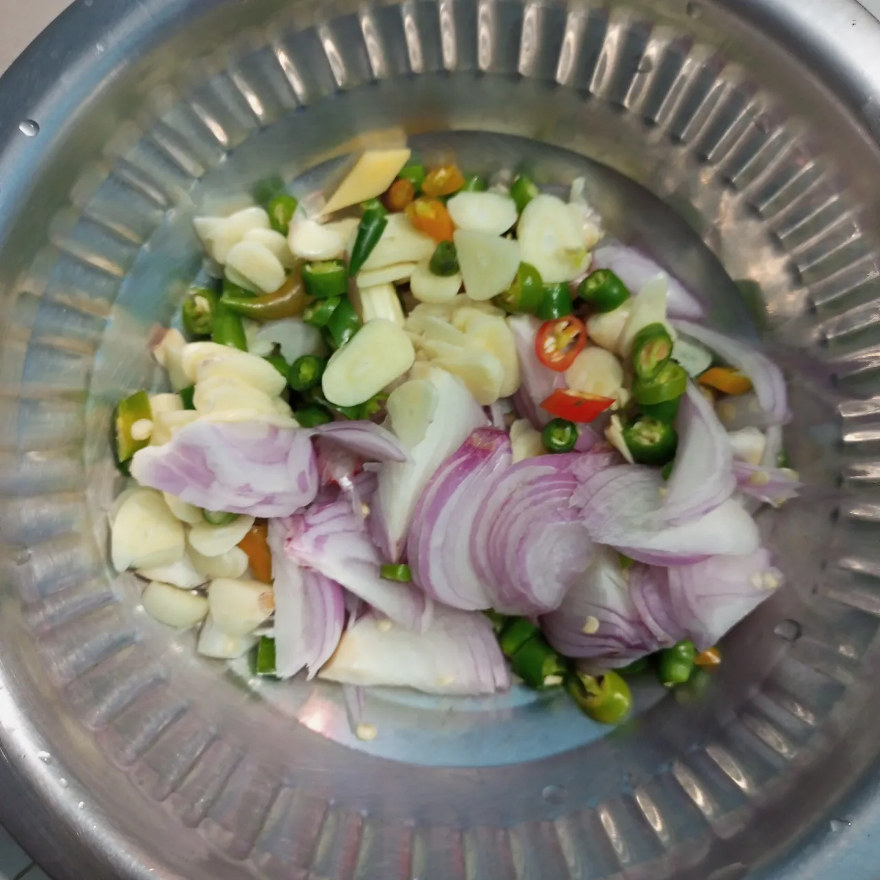 After that, peel the onions and garlic and throw away the chilies. Then on the cutting board you take the size of the cutting board according to your choice.After that, let's put it in a hot oven, then when the dried fish is fried to a nice red color, put it down.
