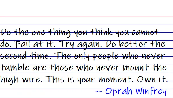 Do the one thing you think you cannot do. Fail at it. Try again. Do better the second time. The only people who never tumble are those who never mount the high wire. This is your moment. Own it.