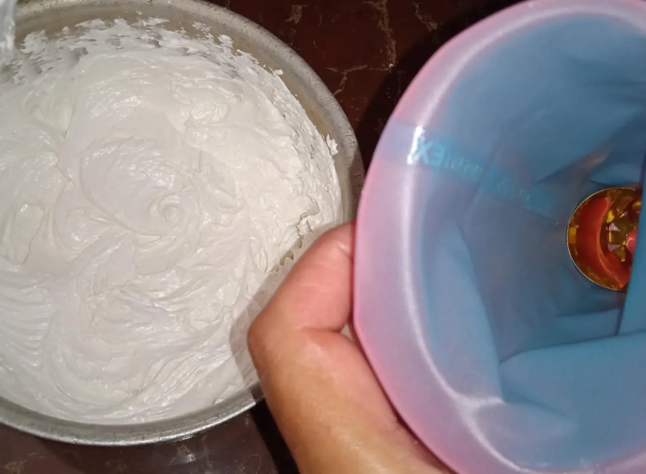 Now, after preparing the mixture, transfer it to a piping bag. A useful trick is to place the piping bag inside a glass and pour the mixture into it. Then, we add the portions on the tray that we have previously prepared with Bond paper.