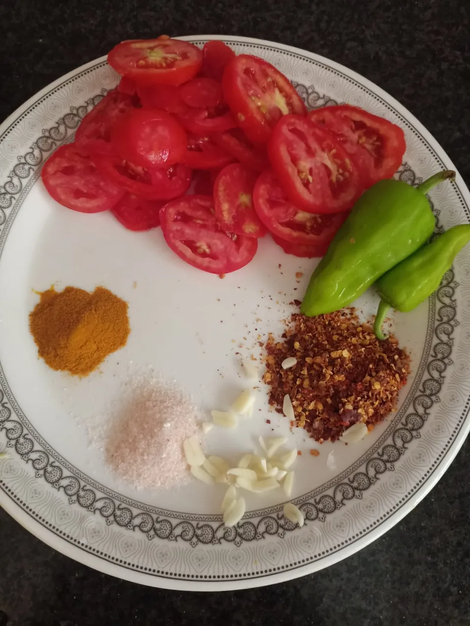 In this picture, you can see all the ingredients gathered on the plate. You can change the amount of Salt and red chilli according to your taste.