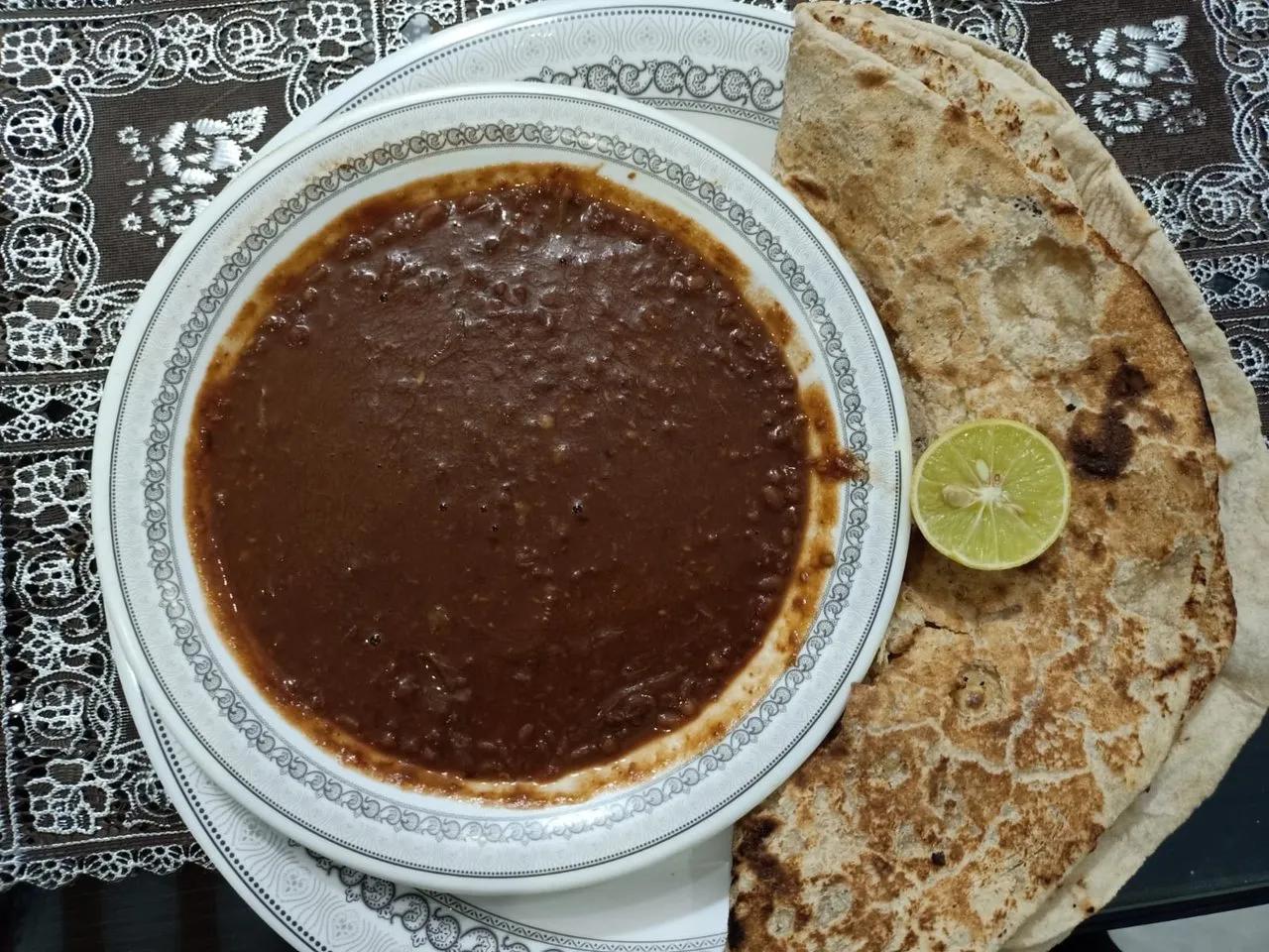 Put it on a medium flame for almost 4 hours until the water becomes half and #rawan lentil got softened. You can see this in this picture.