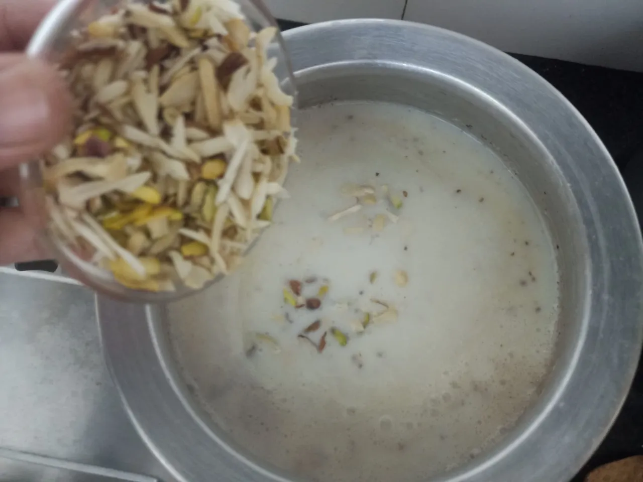 In the second last step, add crushed almonds, cashew nuts and Pistachios to the milk. Now cook this for almost 12 to 15 minutes on a light flame.