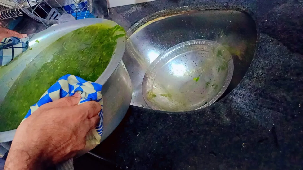 after staining, wash the spinach with fresh water to cool it. Now it will be easy for you to squeeze it. You can see me squeezing it in the picture.