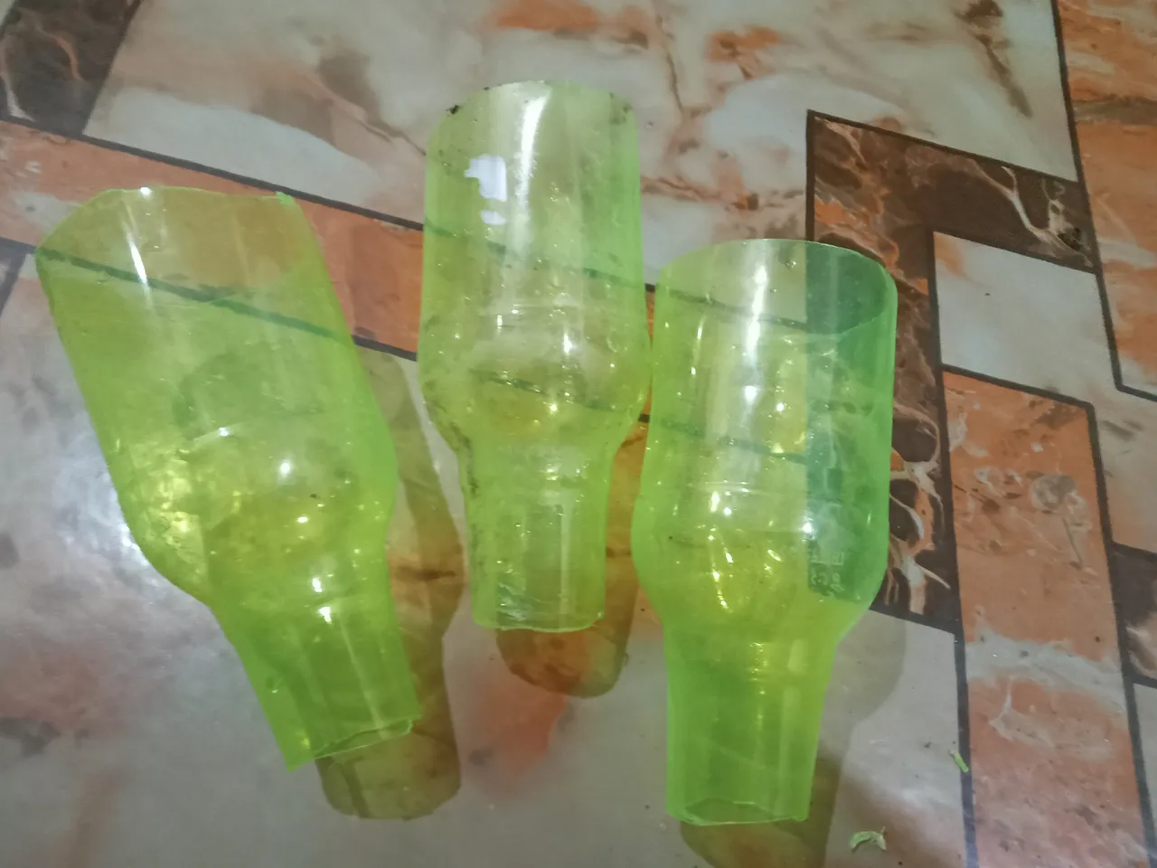 First, I took three discarded bottles, then cut off the bottom and then some of the top with a knife.