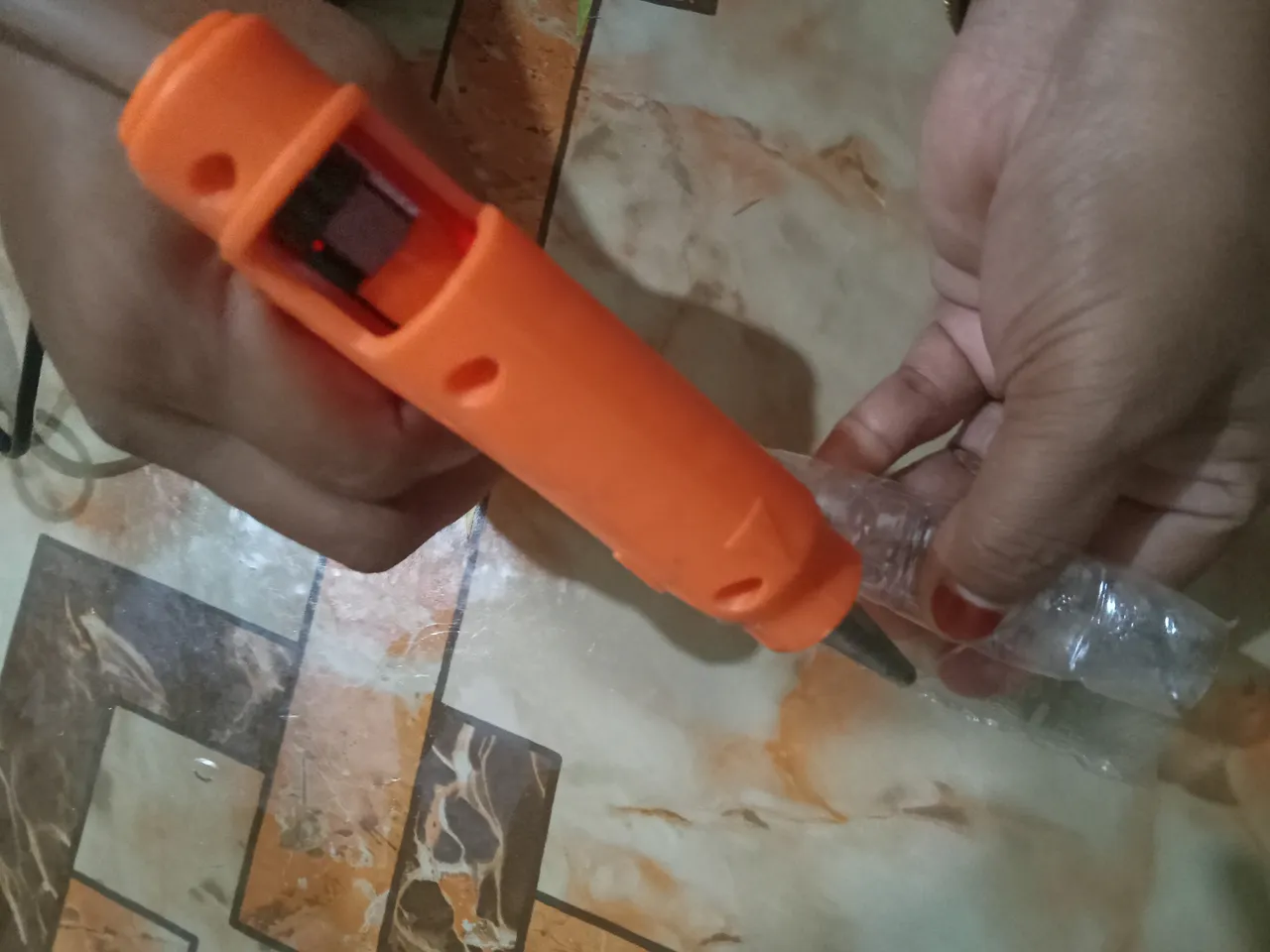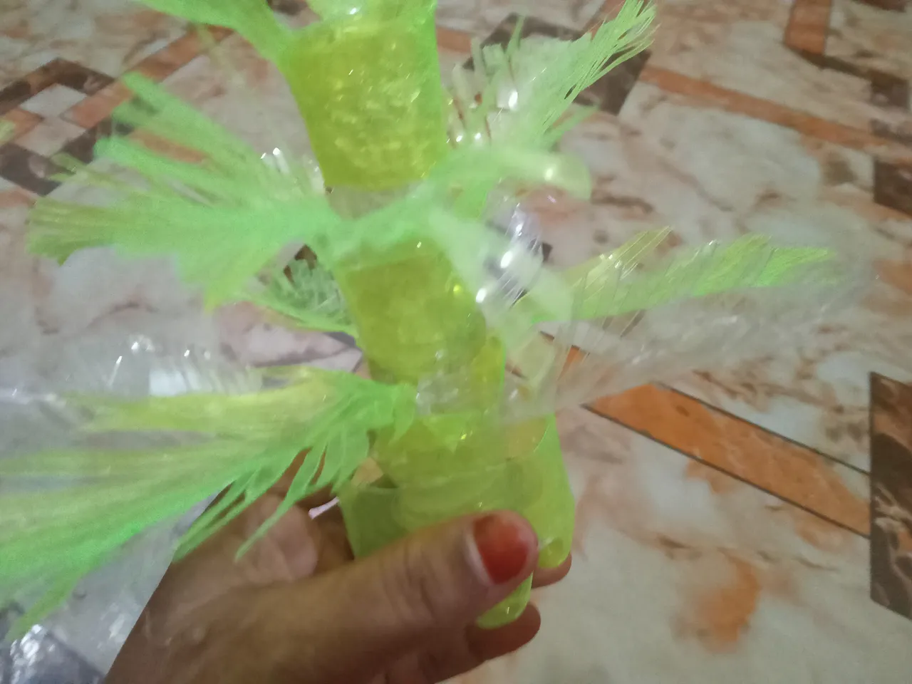 Then I took a part of the bottom of the bottle of soft drinks, then put glue on the bottom of the tree and placed it in the bottom of the bottle.
