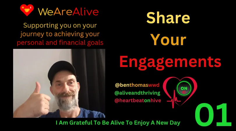 This is Alive Chat for today, come and hang out with the We Are Alive Tribe, get support and ask any question, and share news and ideas, plus we have a task to engage with each day of the week, see schedule below, and make sure to complete the daily task (Today's Topic just below) to be included in our daily contest.