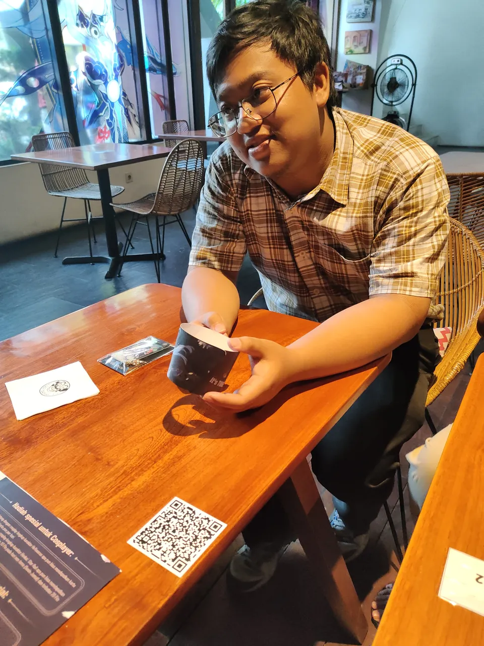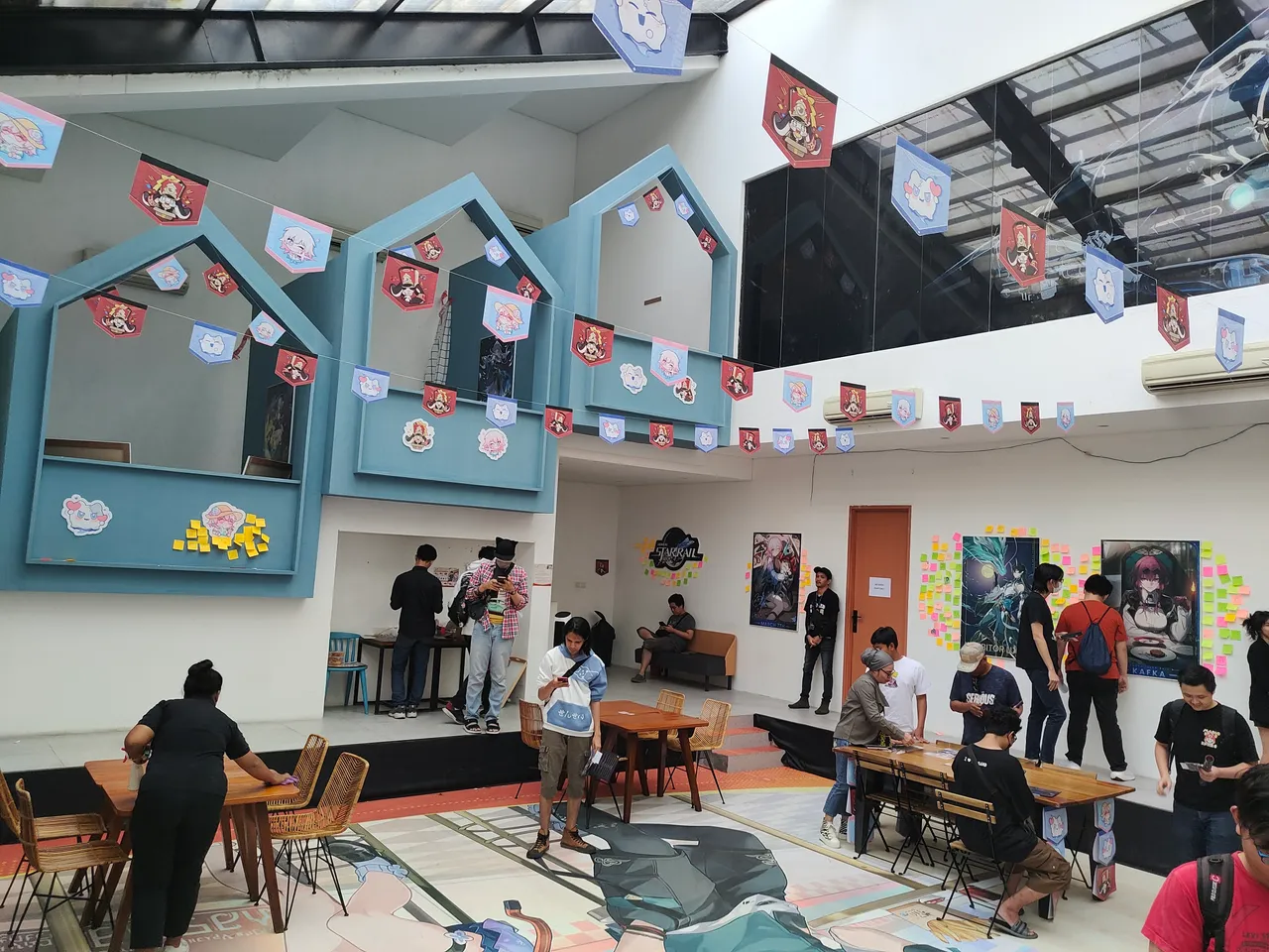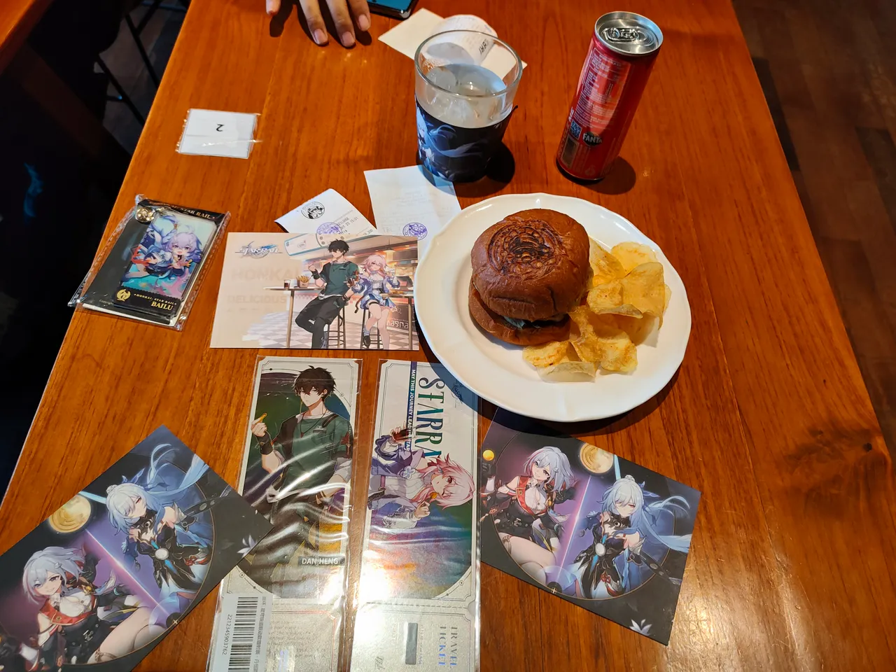 Luckily, the queue is not as long as in the morning but some of the merchandise are already sold out. We look out for what we want and go in to dine in too. Second lunch? No, it's just a snack to fulfill our mission to get the hologram ticket (Game event-related). We'll get a limited reward for fulfilling the mission. The image below shows merchandise (Bailu Acrylic Keychain 79,000 IDR ~ $4.98), a Cheeseburger collaboration with Fanta (110,000 IDR ~ $6.93), and the merchandise that I got after fulfilling the mission (Post video on Tiktok, Post photo/video on Instagram, and show my Honkai Star Rail account). The cheeseburger wasn't too bad but it's good that I got a paper tablecloth, 3 postcards, 2 Hologram tickets with a special redeem code (In-game rewards), and I also took the paper for the cup (It's a takeaway product that they use too). I can display them in my display case.