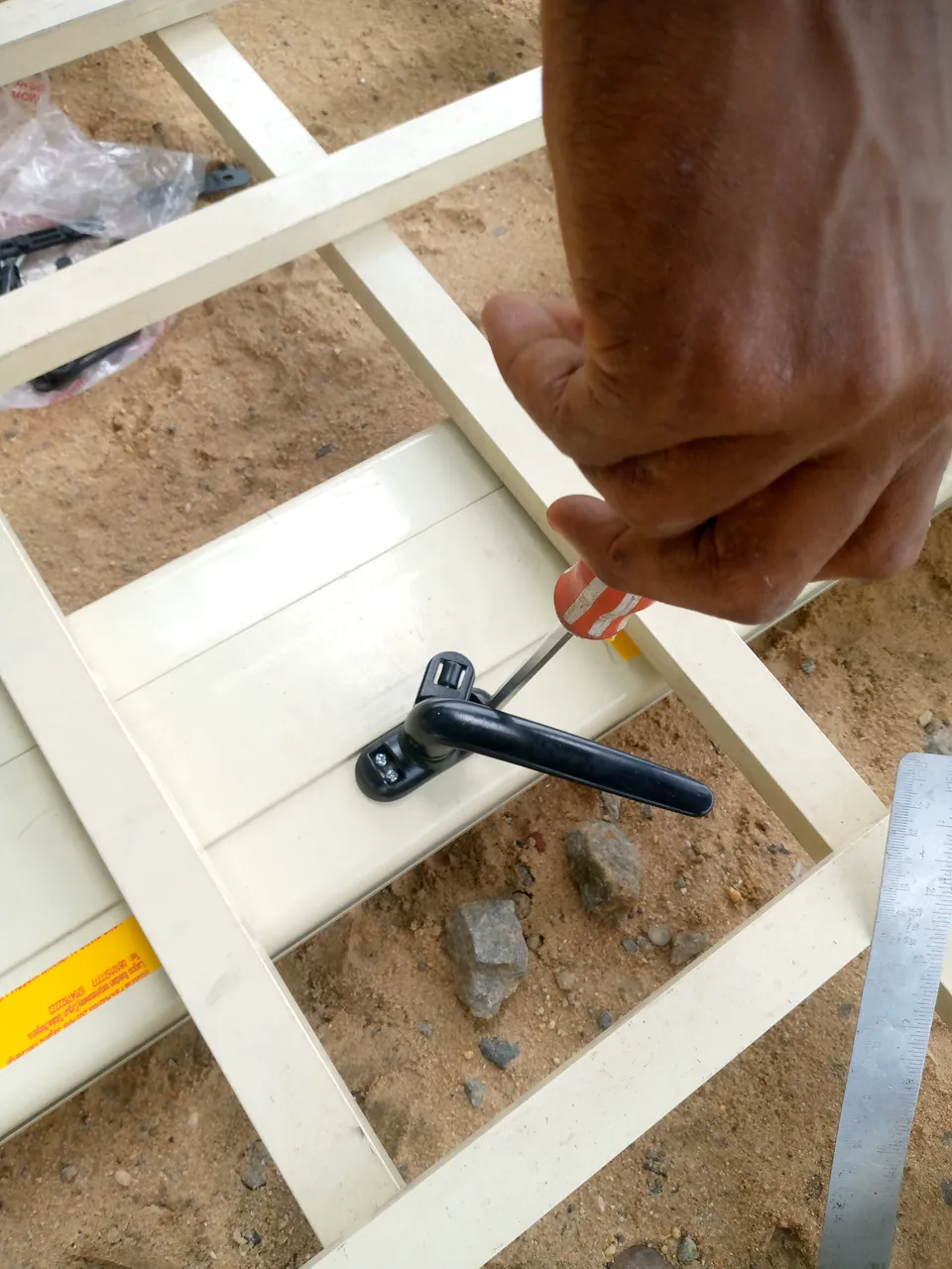 With the pictures below you can I am trying to install the window handle on the window.