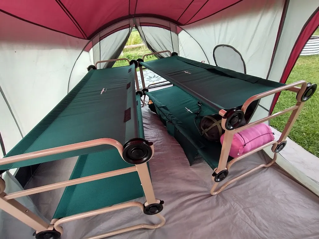 Our campsite didn't have enough room for our canvas bell tent, so we used our previous "10 person" tent. We barely squeezed 8 people inside, even with the double cots.