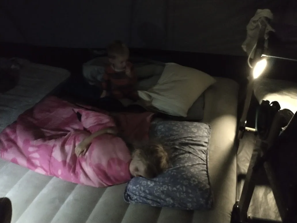 By turning on the light, it woke up my entire family. Everyone had a difficult time getting back to sleep. I filled up the air mattress again and turned off the light and did whatever we could to get our bodies to just relax - but the bugs kept landing on us.
