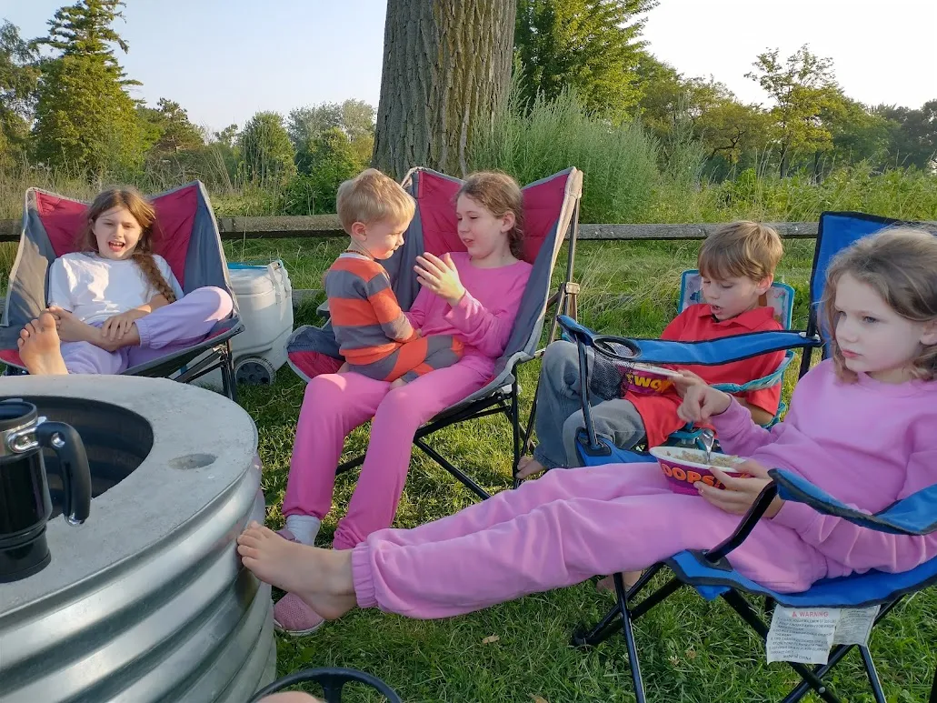 Good job children with the campfire, but daddy is especially happy with cheerful children eating breakfast, while counting their mosquito bites!