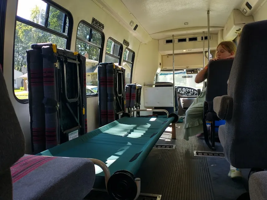 When we got back, we discovered something very special about our new shuttle bus: half of the seats fold up! This is perfect, as we were thinking of ways to load our supplies and having more floor space will make it much easier.