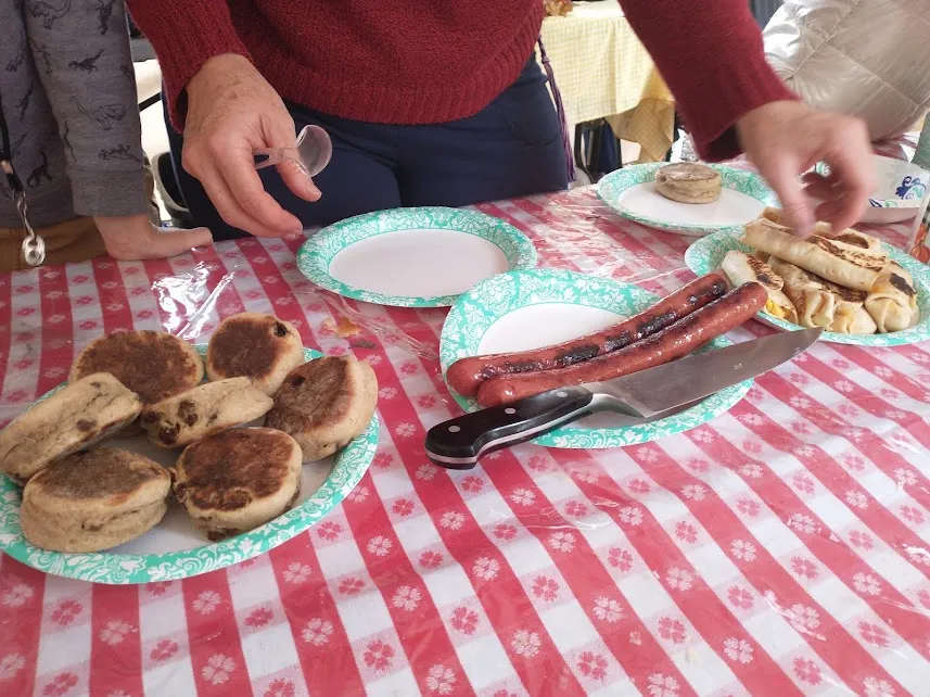 The next morning we enjoyed some pre-made breakfast items, home-made English muffins and pre-cooked beef sausage. YUM! We forgot to bring coffee grounds, so it was an excuse to visit with neighbors for coffee.