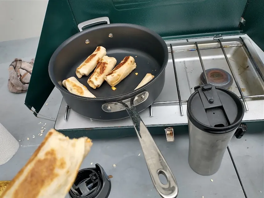 Our camping equipment came in handy this morning, as we set up a table and gas camp stove to make some breakfast. The breakfast burritos were pre-made, all was had to do was heat them up, making breakfast very easy.