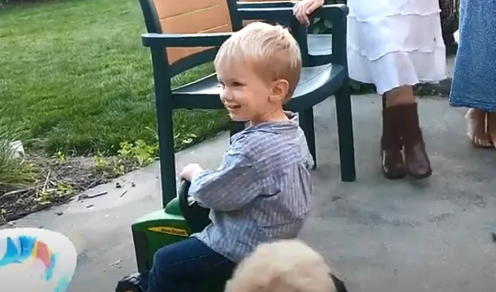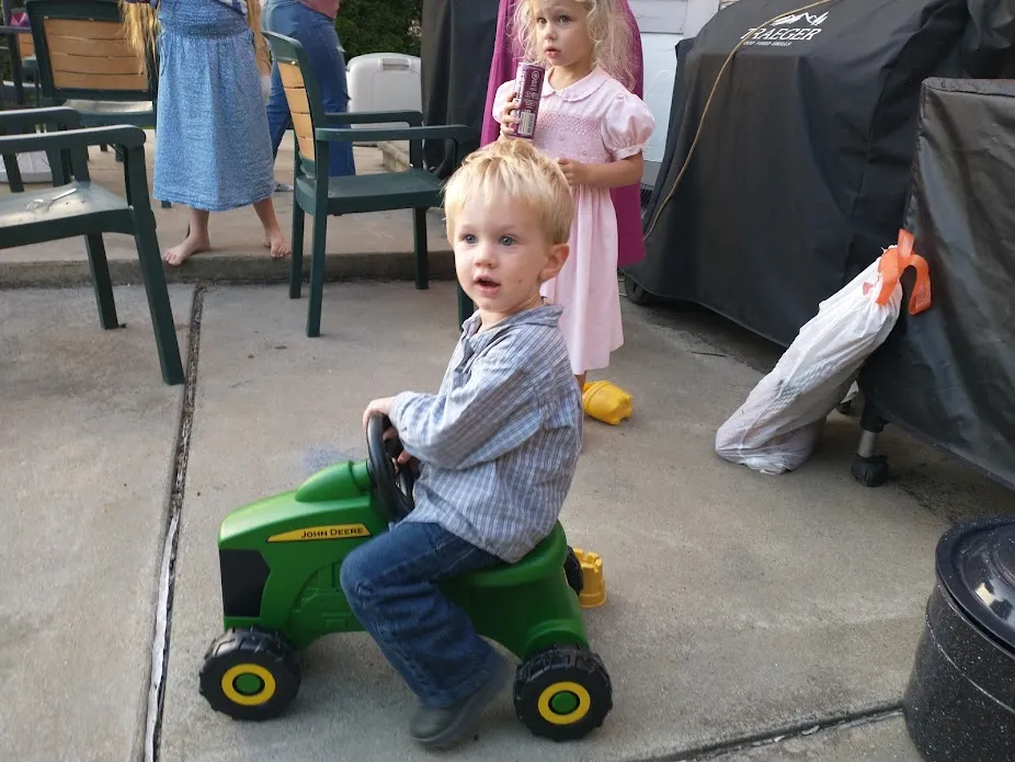 He's really happy with his new "bike", although it's a tractor. We're practicing saying "Trac-tor" but he still prefers saying "bike".