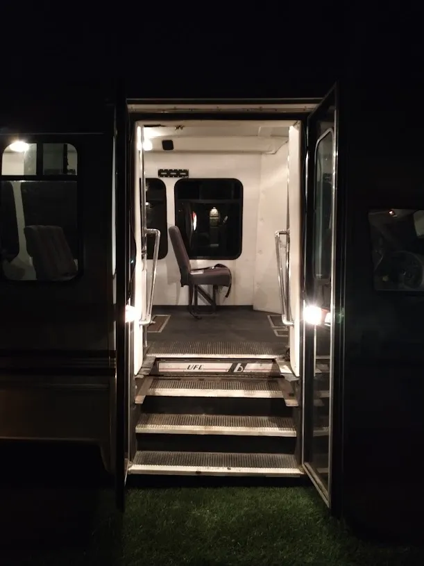 When it was time to go we fired up the bus. After turning on the lights and opening the doors, it looked like some sort of spaceship was taking us away.