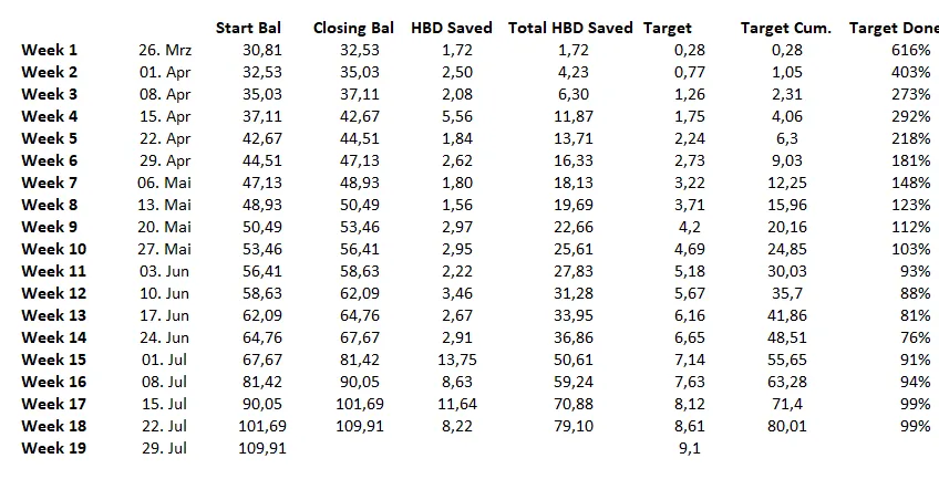 This week I have saved 8,22 HBD which is less than my target of 8,61 HBD, but pretty close. I am still 99% of my savings target which is good. This week I need to save 9,1 HBD so the saving is getting much more challenging and we are not even half way through yet.