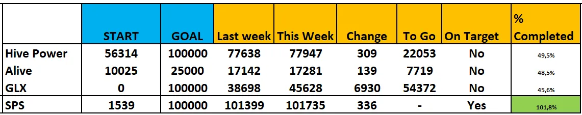 This week my Hive Power grew by 309 which is a good week of growth for me. I am almost at 78k HP and almost at 50% of my goal. I am slightly behind my target but should catch that up easily once we have HPUD on Monday.